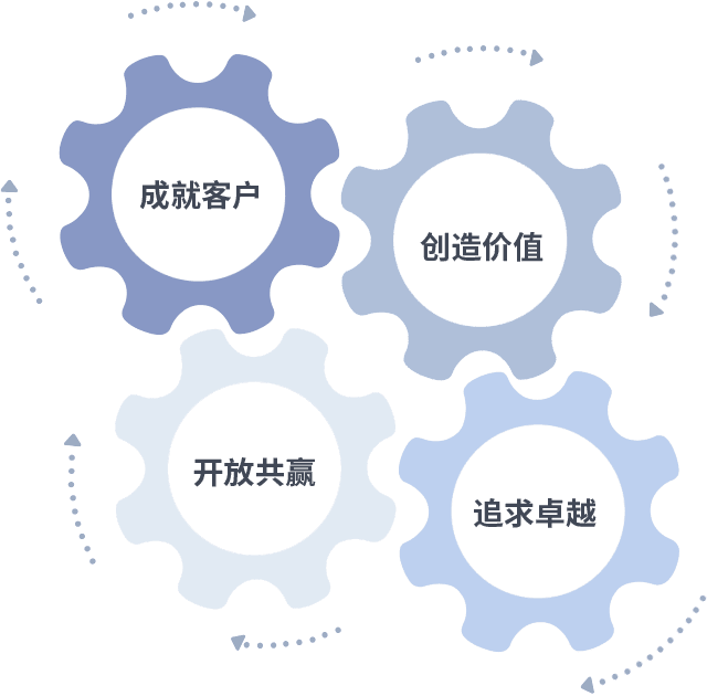 成就客户是一切决策的出发点,,,创造价值是衡量所有工作的标准,,,追求卓越是我们做事做人的态度,,开放共赢是我们的格局也是最终的结果。。。。价值观的齿轮环环相扣,,推动着组织里的每个人不断向前。。。